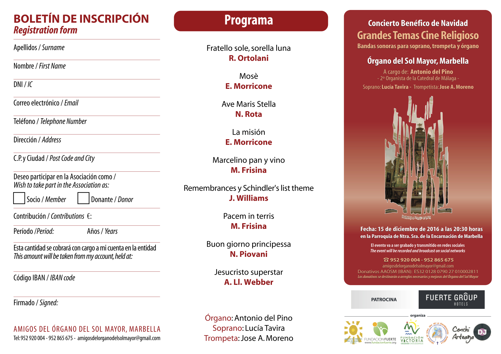 El próximo 15 de Diciembre a las 20:30h, la Parroquia Ntra. Señora de la Encarnación de Marbella, acogerá el Concierto Benéfico de Órgano, organizado por los Amigos del Órgano del Sol Mayor de Marbella y patrocinado por la Fundación Fuerte, evento que será grabado y transmitido en las redes sociales y que está inspirado en los Grandes temas del Cine Religioso.