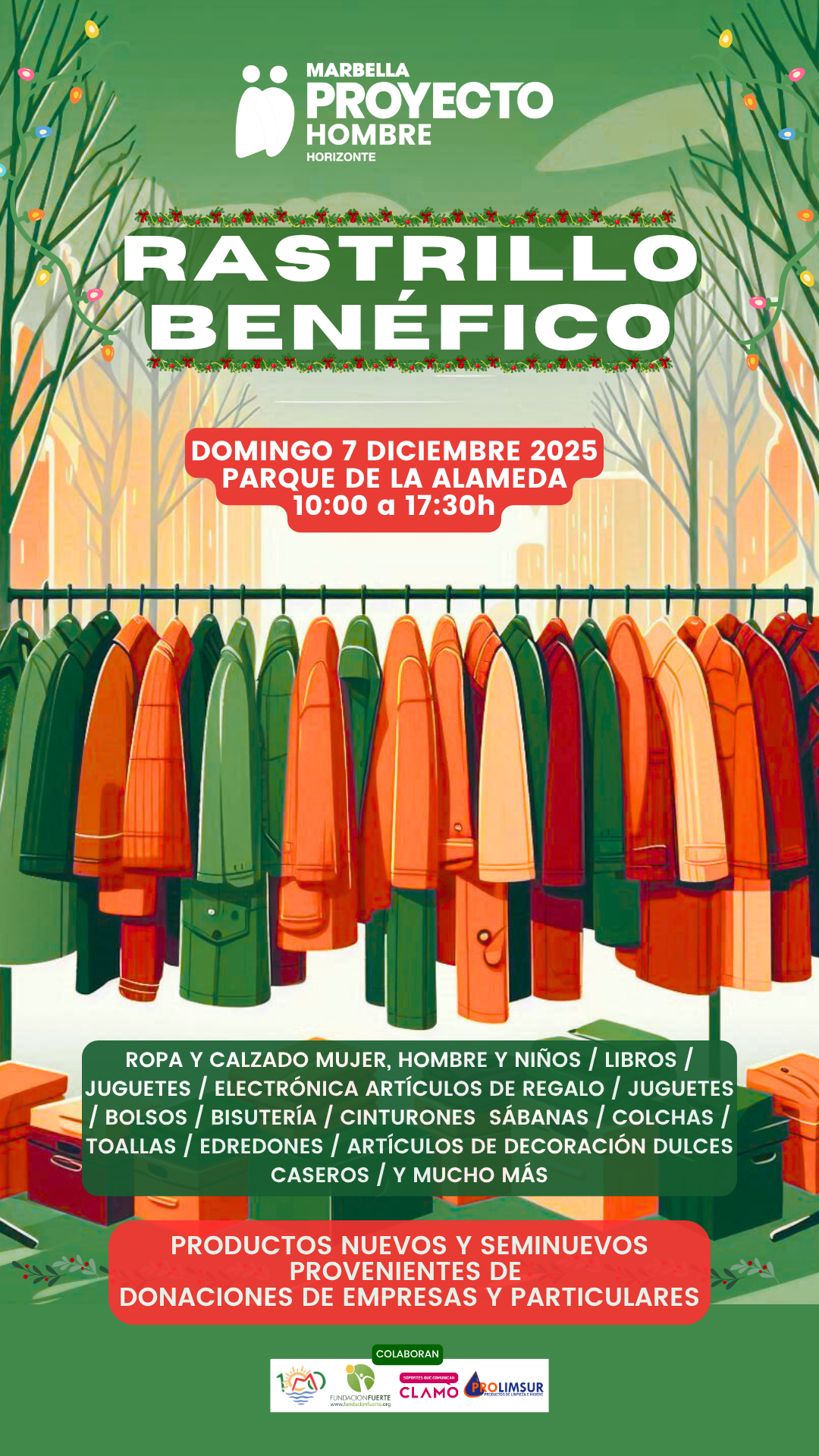 Horizonte Proyecto Hombre Marbella celebra su tradicional Rastrillo Benéfico el próximo domingo 7 de diciembre de 2025, en el Parque de la Alameda, de 10:00 a 17:30 horas. Una jornada solidaria que reunirá a vecinos, visitantes y colaboradores en un ambiente festivo y familiar, lleno de ilusión, compromiso y esperanza.